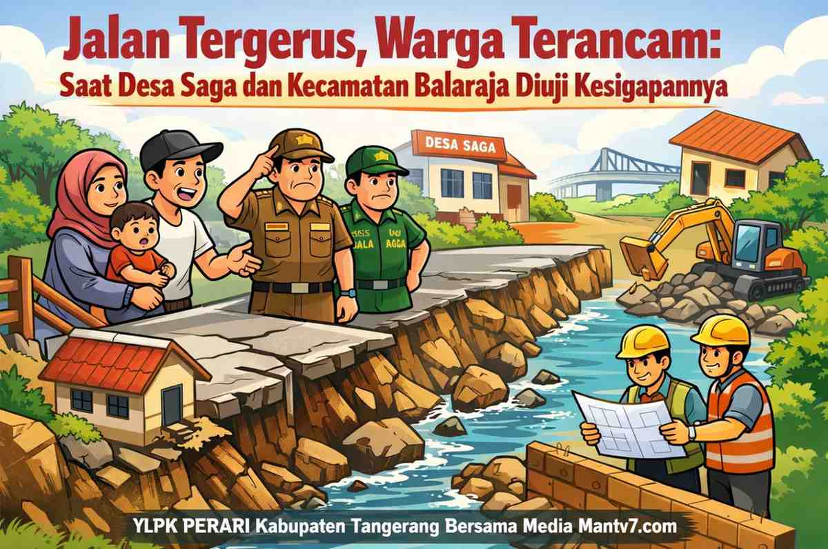 Mantv7.com | Tangerang — Jalan di Perumahan Villa Balaraja, Desa Saga, Kecamatan Balaraja, kini seperti menunggu waktu untuk runtuh. Tanah di bibir sungai terus tergerus, pelan tapi pasti. Ini bukan sekadar kerusakan biasa. Ini ancaman nyata yang dilihat setiap hari oleh warga. Dan di tengah situasi ini, sorotan publik mulai mengarah: Desa Saga dan Kecamatan Balaraja jangan hanya diam.